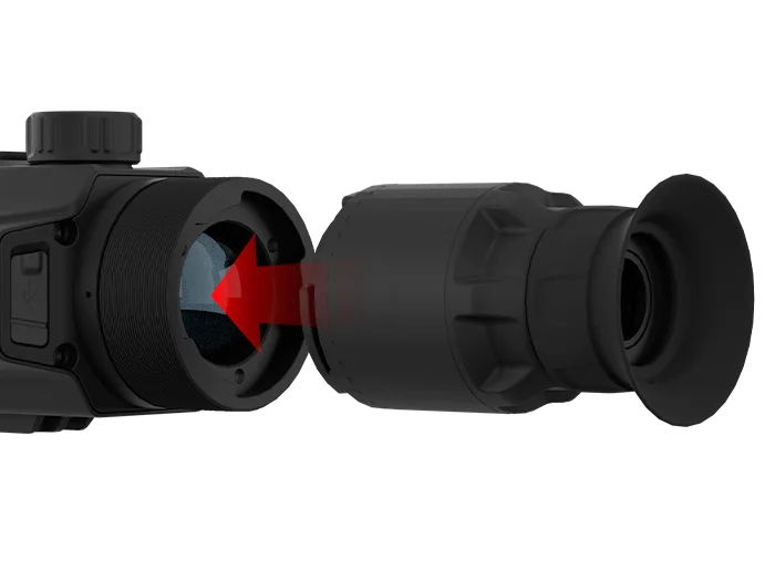 En fixant cet oculaire, votre clip-on se transforme en monoculaire thermique, offrant une fonctionnalité polyvalente pour tous vos besoins. By attaching this eyepiece, your clip-on will transform into a thermal monocular, providing versatile functionality for all your needs. *accessoire optionnel.