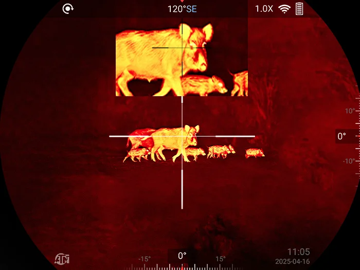 Verrouillez votre cible sans jamais perdre de vue votre environnement. Le mode PIP vous permet de zoomer pour une précision maximale tout en conservant une fenêtre secondaire à large champ de vision. Que vous aligniez un coyote à 200 mètres ou suiviez des sangliers à travers un champ, vous bénéficiez du niveau de détail nécessaire sans sacrifier la conscience situationnelle qui vous garde aux commandes. Rapide, intuitif et conçu pour les chasseurs réels dans des conditions réelles.